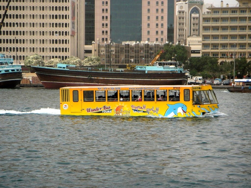 Wonder Bus Tour is another Dubai city bus touring company, which was established in 2002 with a 40-seater bus manufactured in the United States. The air-conditioned bus is spacious with a large TV screen, an internal bathroom and refreshments are served during the tour of Dubai. The unique experience about riding this bus is that the tour of Dubai takes you around Dubai and also takes you on water, up and down the Dubai Creek. For safety measures, a life jacket is found under each seat and the bus has an automatic fire extinguishing system.